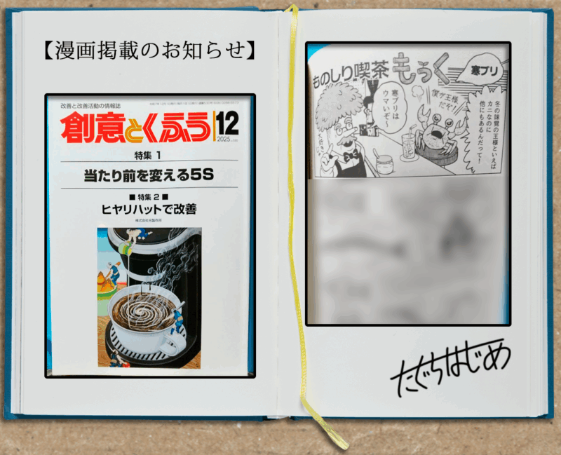 「創意とくふう」12月号に漫画が掲載! 2025年11月27日 情報月刊誌「創意とくふう」で連載中の雑学漫画「ものしり喫茶もっく」今回のネタは「寒ブリ」です。 なるほど!へぇ!な4ページ、職場などで見かけましたら是非ご一読くださいませ♪(※一般の書店では流通していない本です)
